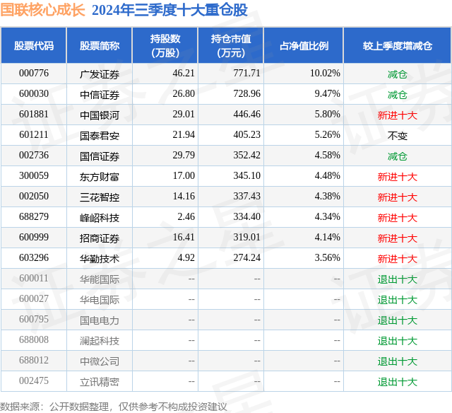 从基金规模来看,国联核心成长基金2024年三季度公布的基金规模为0.77亿元,较上一期规模8375.43万元变化了-673.91万元,环比变化了-8.05%。该基金最新一期资产配置为:股票占净值比91.17%,债券占净值比5.28%,现金占净值比2.56%。从基金持仓来看,该基金当季前十大股票仓位达56.03%,第一大重仓股为广发证券(000776),持仓占比为10.02%。