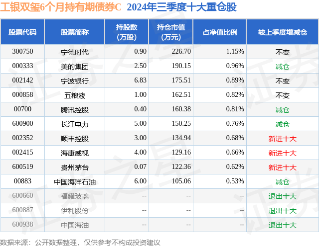 从基金规模来看,工银双玺6个月持有期债券C基金2024年三季度公布的基金规模为0.08亿元,较上一期规模996.21万元变化了-193.39万元,环比变化了-19.41%。该基金最新一期资产配置为:股票占净值比18.09%,债券占净值比102.5%,现金占净值比3.05%。从基金持仓来看,该基金当季前十大股票仓位达7.88%,第一大重仓股为宁德时代(300750),持仓占比为1.15%。
