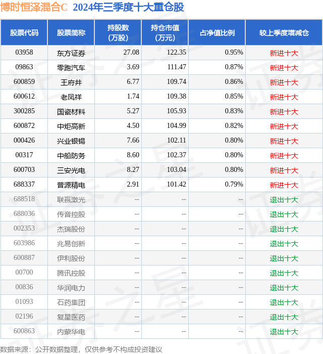 证券之星消息,日前博时恒泽混合C基金公布三季报,2024年三季度最新规模0.27亿元,季度净值涨幅为2.84%。