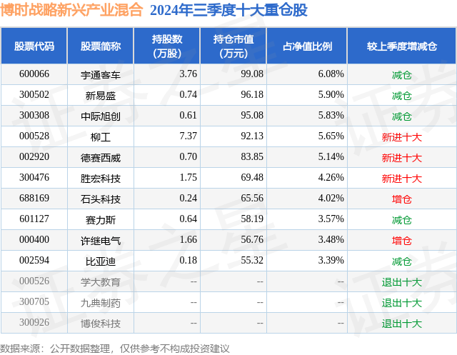 从基金规模来看,博时战略新兴产业混合基金2024年三季度公布的基金规模为0.16亿元,较上一期规模1583.22万元变化了47.4万元,环比变化了2.99%。该基金最新一期资产配置为:股票占净值比93.04%,债券占净值比5.56%,现金占净值比1.43%。从基金持仓来看,该基金当季前十大股票仓位达47.32%,第一大重仓股为宇通客车(600066),持仓占比为6.08%。