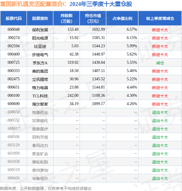 从基金规模来看,富国新机遇灵活配置混合C基金2024年三季度公布的基金规模为0.48亿元,较上一期规模2155.3万元变化了2615.73万元,环比变化了121.36%。该基金最新一期资产配置为:股票占净值比75.59%,无债券类资产,现金占净值比14.91%。从基金持仓来看,该基金当季前十大股票仓位达53.56%,第一大重仓股为保利发展(600048),持仓占比为6.57%。