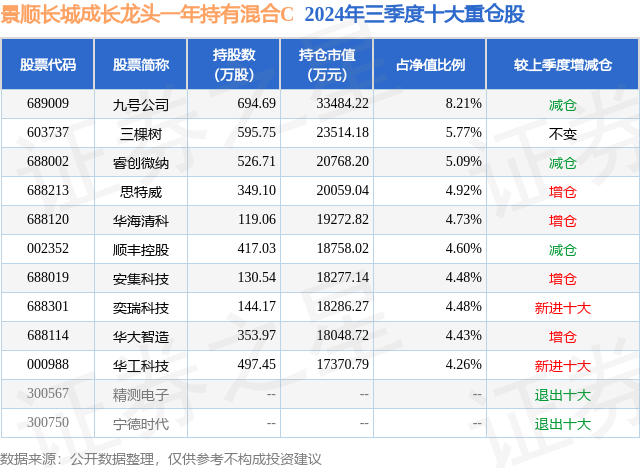 从基金规模来看,景顺长城成长龙头一年持有混合C基金2024年三季度公布的基金规模为4.11亿元,较上一期规模3.68亿元变化了4310.19万元,环比变化了11.7%。该基金最新一期资产配置为:股票占净值比91.91%,债券占净值比2.94%,现金占净值比3.27%。从基金持仓来看,该基金当季前十大股票仓位达50.97%,第一大重仓股为九号公司(689009),持仓占比为8.21%。