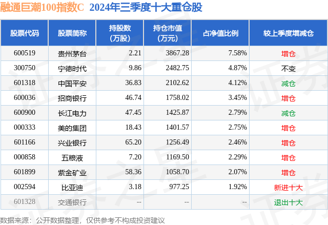 从基金规模来看,融通巨潮100指数C基金2024年三季度公布的基金规模为0.04亿元,较上一期规模302.19万元变化了70.97万元,环比变化了23.49%。该基金最新一期资产配置为:股票占净值比94.5%,债券占净值比2.66%,现金占净值比2.62%。从基金持仓来看,该基金当季前十大股票仓位达34.3%,第一大重仓股为贵州茅台(600519),持仓占比为7.58%。