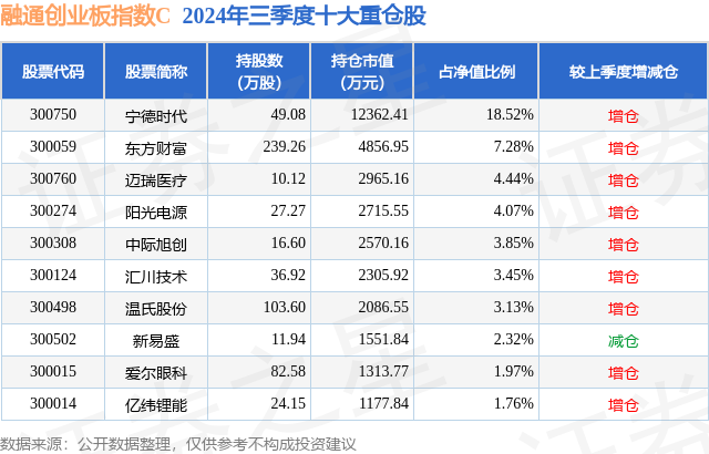 从基金规模来看,融通创业板指数C基金2024年三季度公布的基金规模为1.07亿元,较上一期规模5847.93万元变化了4898.0万元,环比变化了83.76%。该基金最新一期资产配置为:股票占净值比94.02%,债券占净值比3.87%,现金占净值比1.81%。从基金持仓来看,该基金当季前十大股票仓位达50.79%,第一大重仓股为宁德时代(300750),持仓占比为18.52%。