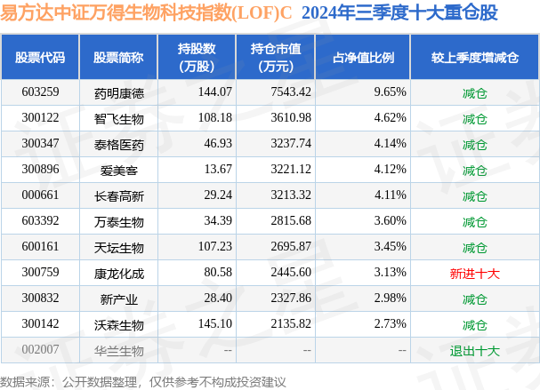 证券之星消息,日前易方达中证万得生物科技指数(LOF)C基金公布三季报,2024年三季度最新规模0.92亿元,季度净值涨幅为20.62%。