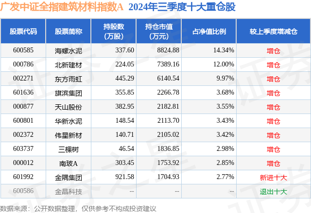 从基金规模来看,广发中证全指建筑材料指数A基金2024年三季度公布的基金规模为3.3亿元,较上一期规模2.92亿元变化了3774.72万元,环比变化了12.91%。该基金最新一期资产配置为:股票占净值比92.98%,无债券类资产,现金占净值比6.57%。从基金持仓来看,该基金当季前十大股票仓位达58.99%,第一大重仓股为海螺水泥(600585),持仓占比为14.34%。