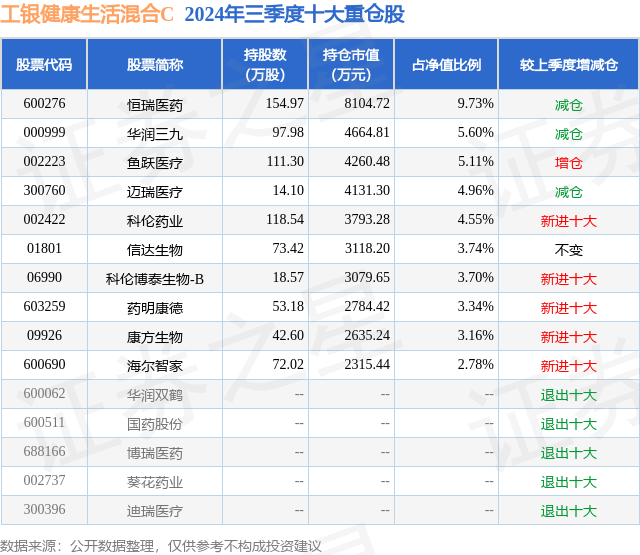 从基金规模来看,工银健康生活混合C基金2024年三季度公布的基金规模为1.47亿元,较上一期规模1.35亿元变化了1237.78万元,环比变化了9.2%。该基金最新一期资产配置为:股票占净值比94.45%,无债券类资产,现金占净值比7.28%。从基金持仓来看,该基金当季前十大股票仓位达46.67%,第一大重仓股为恒瑞医药(600276),持仓占比为9.73%。