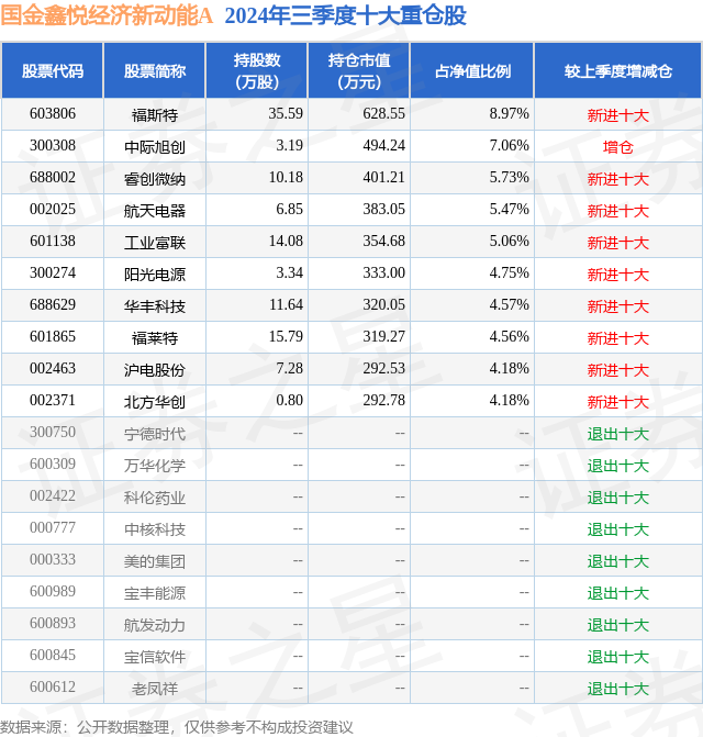 从基金规模来看,国金鑫悦经济新动能A基金2024年三季度公布的基金规模为0.4亿元,较上一期规模4272.18万元变化了-253.74万元,环比变化了-5.94%。该基金最新一期资产配置为:股票占净值比92.03%,无债券类资产,现金占净值比8.62%。从基金持仓来看,该基金当季前十大股票仓位达54.53%,第一大重仓股为福斯特(603806),持仓占比为8.97%。