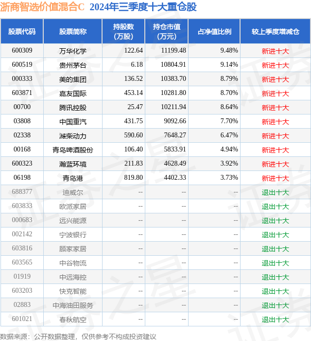 证券之星消息,日前浙商智选价值混合C基金公布三季报,2024年三季度最新规模3.14亿元,季度净值涨幅为4.3%。