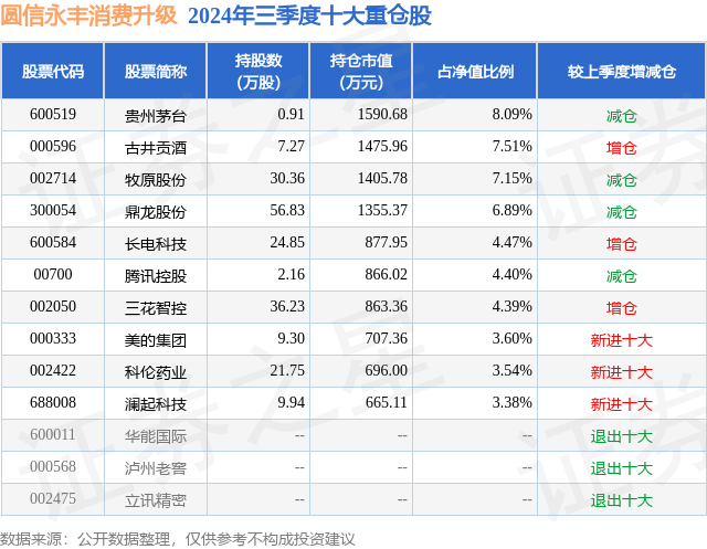 从基金规模来看,圆信永丰消费升级基金2024年三季度公布的基金规模为1.97亿元,较上一期规模1.89亿元变化了807.85万元,环比变化了4.28%。该基金最新一期资产配置为:股票占净值比88.43%,债券占净值比5.1%,现金占净值比1.91%。从基金持仓来看,该基金当季前十大股票仓位达53.42%,第一大重仓股为贵州茅台(600519),持仓占比为8.09%。