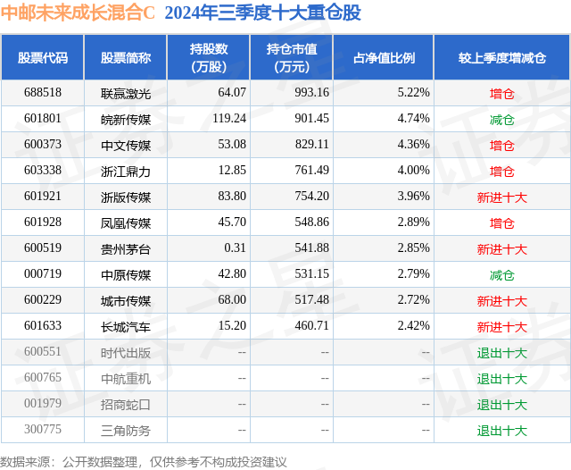 从基金规模来看,中邮未来成长混合C基金2024年三季度公布的基金规模为0.58亿元,较上一期规模5996.02万元变化了-224.45万元,环比变化了-3.74%。该基金最新一期资产配置为:股票占净值比91.35%,无债券类资产,现金占净值比8.72%。从基金持仓来看,该基金当季前十大股票仓位达35.95%,第一大重仓股为联赢激光(688518),持仓占比为5.22%。