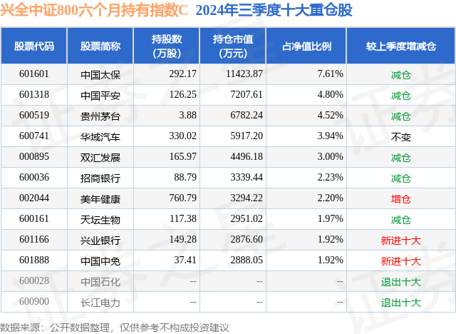 从基金规模来看,兴全中证800六个月持有指数C基金2024年三季度公布的基金规模为1.24亿元,较上一期规模1.09亿元变化了1461.59万元,环比变化了13.37%。该基金最新一期资产配置为:股票占净值比94.0%,债券占净值比11.25%,现金占净值比0.2%。从基金持仓来看,该基金当季前十大股票仓位达34.11%,第一大重仓股为中国太保(601601),持仓占比为7.61%。