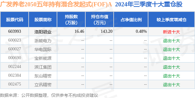 从基金规模来看,广发养老2050五年持有混合发起式(FOF)A基金2024年三季度公布的基金规模为2.06亿元,较上一期规模1.99亿元变化了645.03万元,环比变化了3.23%。该基金最新一期资产配置为:股票占净值比0.48%,债券占净值比4.35%,现金占净值比1.72%。从基金持仓来看,该基金当季前十大股票仓位达0.48%,第一大重仓股为洛阳钼业(603993),持仓占比为0.48%。