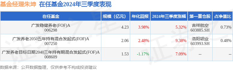 证券之星消息,日前广发养老2050五年持有混合发起式(FOF)A基金公布三季报,2024年三季度最新规模2.06亿元,季度净值涨幅为9.38%。