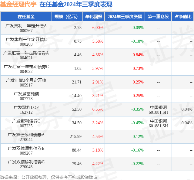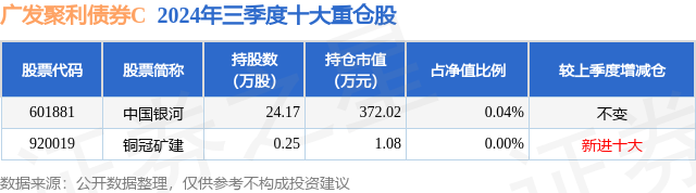 从基金规模来看,广发聚利债券C基金2024年三季度公布的基金规模为34.5亿元,较上一期规模19.95亿元变化了14.55亿元,环比变化了72.93%。该基金最新一期资产配置为:股票占净值比0.04%,债券占净值比131.64%,现金占净值比0.39%。从基金持仓来看,该基金当季前十大股票仓位达0.04%,第一大重仓股为中国银河(601881),持仓占比为0.04%。
