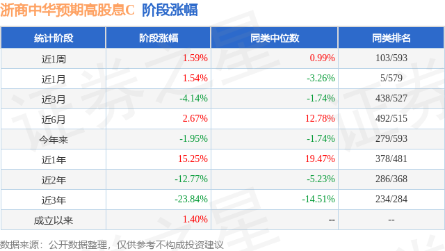 从业绩表现来看,浙商中华预期高股息C基金过去一年净值涨幅为10.37%,在同类基金中排名208/457,同类基金过去一年净值涨幅中位数为10.83%。而基金过去一年的最大回撤为-23.49%,成立以来的最大回撤为-41.41%。