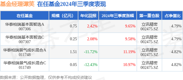 从基金规模来看,华泰柏瑞基本面智选A基金2024年三季度公布的基金规模为0.75亿元,较上一期规模7345.7万元变化了154.44万元,环比变化了2.1%。该基金最新一期资产配置为:股票占净值比91.19%,债券占净值比2.32%,现金占净值比7.08%。从基金持仓来看,该基金当季前十大股票仓位达34.34%,第一大重仓股为立讯精密(002475),持仓占比为4.79%。