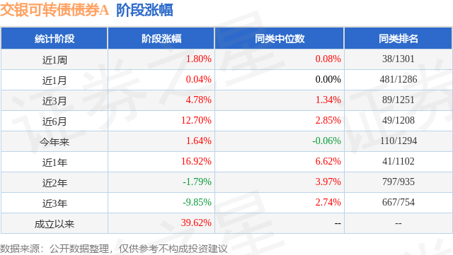 从业绩表现来看,交银可转债债券A基金过去一年净值涨幅为5.13%,在同类基金中排名570/1063,同类基金过去一年净值涨幅中位数为4.0%。而基金过去一年的最大回撤为-17.63%,成立以来的最大回撤为-29.75%。