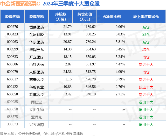 从基金规模来看,中金新医药股票C基金2024年三季度公布的基金规模为0.22亿元,较上一期规模2055.84万元变化了169.22万元,环比变化了8.23%。该基金最新一期资产配置为:股票占净值比91.29%,债券占净值比0.16%,现金占净值比5.97%。从基金持仓来看,该基金当季前十大股票仓位达50.21%,第一大重仓股为恒瑞医药(600276),持仓占比为9.06%。