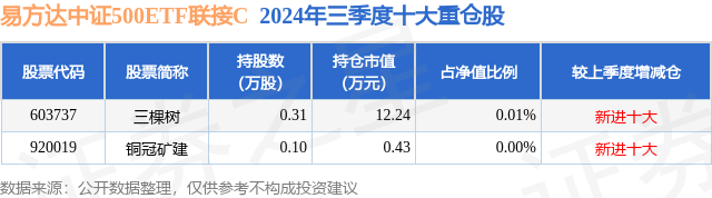 从基金规模来看,易方达中证500ETF联接C基金2024年三季度公布的基金规模为6.14亿元,较上一期规模4.18亿元变化了1.96亿元,环比变化了46.98%。该基金最新一期资产配置为:股票占净值比0.01%,债券占净值比1.78%,现金占净值比2.82%。从基金持仓来看,该基金当季前十大股票仓位达0.01%,第一大重仓股为三棵树(603737),持仓占比为0.01%。