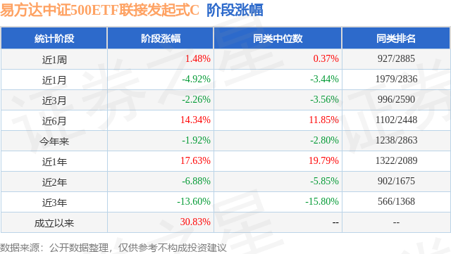 从业绩表现来看,易方达中证500ETF联接C基金过去一年净值涨幅为8.68%,在同类基金中排名1340/1981,同类基金过去一年净值涨幅中位数为13.77%。而基金过去一年的最大回撤为-20.2%,成立以来的最大回撤为-36.5%。