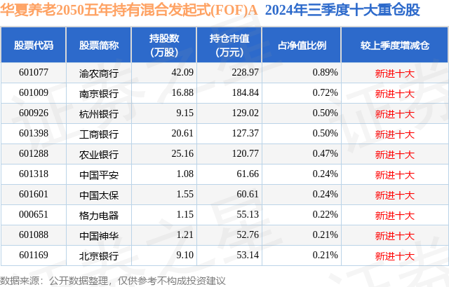 从基金规模来看,华夏养老2050五年持有混合发起式(FOF)A基金2024年三季度公布的基金规模为2.11亿元,较上一期规模2.11亿元变化了-13.06万元,环比变化了-0.06%。该基金最新一期资产配置为:股票占净值比4.4%,债券占净值比4.91%,现金占净值比0.71%。从基金持仓来看,该基金当季前十大股票仓位达4.2%,第一大重仓股为渝农商行(601077),持仓占比为0.89%。