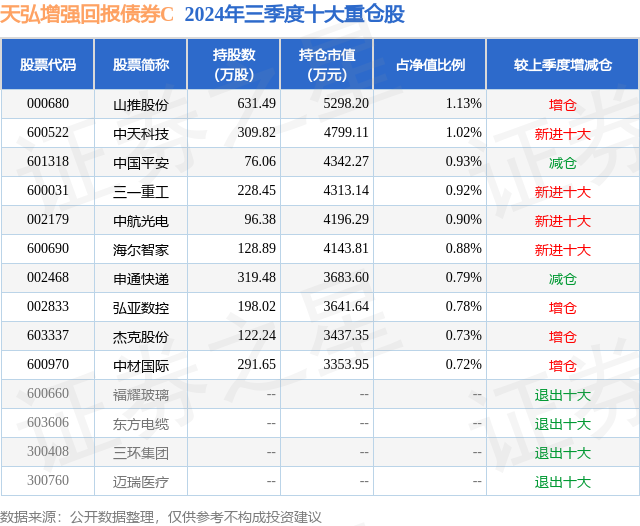 从基金规模来看,天弘增强回报债券C基金2024年三季度公布的基金规模为19.63亿元,较上一期规模20.63亿元变化了-9915.59万元,环比变化了-4.81%。该基金最新一期资产配置为:股票占净值比20.45%,债券占净值比101.54%,现金占净值比6.27%。从基金持仓来看,该基金当季前十大股票仓位达8.8%,第一大重仓股为山推股份(000680),持仓占比为1.13%。