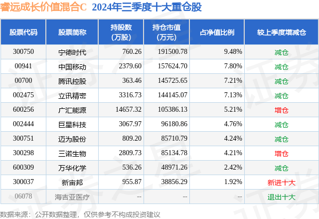 从基金规模来看,睿远成长价值混合C基金2024年三季度公布的基金规模为21.86亿元,较上一期规模20.23亿元变化了1.63亿元,环比变化了8.08%。该基金最新一期资产配置为:股票占净值比85.85%,债券占净值比4.92%,现金占净值比0.43%。从基金持仓来看,该基金当季前十大股票仓位达54.38%,第一大重仓股为宁德时代(300750),持仓占比为9.48%。