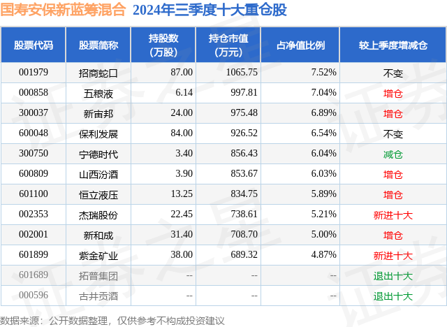 从基金规模来看,国寿安保新蓝筹混合基金2024年三季度公布的基金规模为1.42亿元,较上一期规模1.16亿元变化了2518.65万元,环比变化了21.62%。该基金最新一期资产配置为:股票占净值比94.1%,债券占净值比0.86%,现金占净值比4.73%。从基金持仓来看,该基金当季前十大股票仓位达61.03%,第一大重仓股为招商蛇口(001979),持仓占比为7.52%。