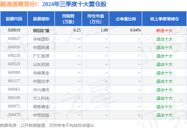 从基金规模来看,融通通慧混合C基金2024年三季度公布的基金规模为0.13亿元,较上一期规模1448.9万元变化了-138.62万元,环比变化了-9.57%。该基金最新一期资产配置为:股票占净值比0.04%,债券占净值比73.04%,现金占净值比4.89%。从基金持仓来看,该基金当季前十大股票仓位达0.04%,第一大重仓股为铜冠矿建(920019),持仓占比为0.04%。