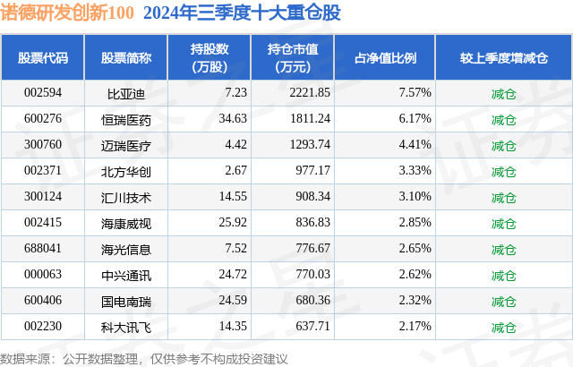 从基金规模来看,诺德研发创新100基金2024年三季度公布的基金规模为2.93亿元,较上一期规模3.02亿元变化了-831.61万元,环比变化了-2.76%。该基金最新一期资产配置为:股票占净值比94.43%,无债券类资产,现金占净值比5.22%。从基金持仓来看,该基金当季前十大股票仓位达37.19%,第一大重仓股为比亚迪(002594),持仓占比为7.57%。