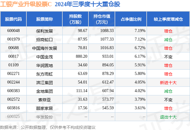 从基金规模来看,工银产业升级股票C基金2024年三季度公布的基金规模为1.06亿元,较上一期规模5942.11万元变化了4654.13万元,环比变化了78.32%。该基金最新一期资产配置为:股票占净值比70.07%,债券占净值比1.86%,现金占净值比4.33%。从基金持仓来看,该基金当季前十大股票仓位达54.38%,第一大重仓股为保利发展(600048),持仓占比为7.19%。
