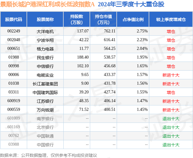 从基金规模来看,景顺长城沪港深红利成长低波指数A基金2024年三季度公布的基金规模为2.21亿元,较上一期规模1.61亿元变化了6007.67万元,环比变化了37.27%。该基金最新一期资产配置为:股票占净值比90.62%,无债券类资产,现金占净值比7.8%。从基金持仓来看,该基金当季前十大股票仓位达18.22%,第一大重仓股为大洋电机(002249),持仓占比为2.75%。