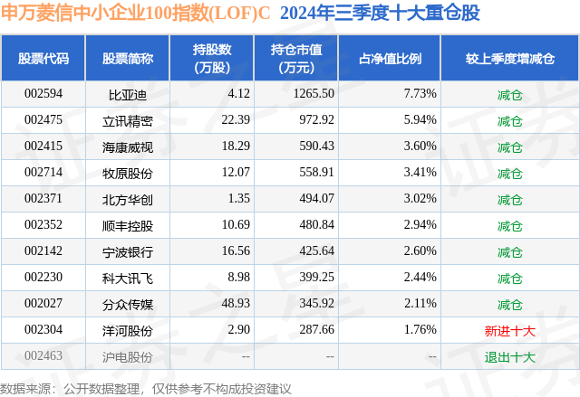 从基金规模来看,申万菱信中小企业100指数(LOF)C基金2024年三季度公布的基金规模为0.27亿元,较上一期规模2422.32万元变化了290.21万元,环比变化了11.98%。该基金最新一期资产配置为:股票占净值比93.72%,无债券类资产,现金占净值比6.19%。从基金持仓来看,该基金当季前十大股票仓位达35.55%,第一大重仓股为比亚迪(002594),持仓占比为7.73%。