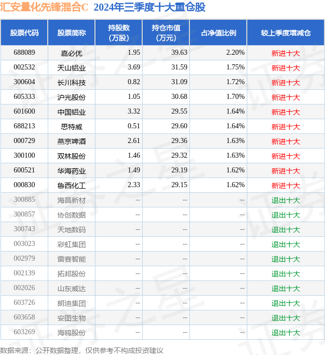 从基金规模来看,汇安量化先锋混合C基金2024年三季度公布的基金规模为0.06亿元,较上一期规模567.29万元变化了4.67万元,环比变化了0.82%。该基金最新一期资产配置为:股票占净值比91.36%,无债券类资产,现金占净值比8.98%。从基金持仓来看,该基金当季前十大股票仓位达17.15%,第一大重仓股为嘉必优(688089),持仓占比为2.2%。