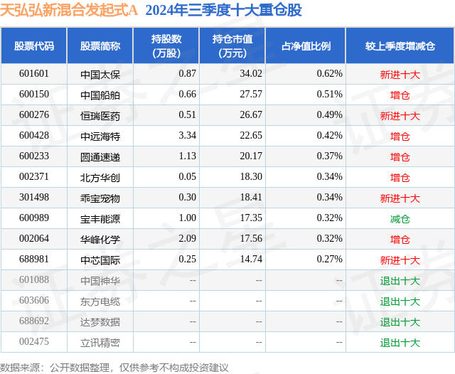 证券之星消息,日前天弘弘新混合发起式A基金公布三季报,2024年三季度最新规模0.54亿元,季度净值涨幅为0.84%。