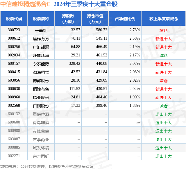 证券之星消息,日前中信建投精选混合C基金公布三季报,2024年三季度最新规模0.72亿元,季度净值涨幅为12.14%。
