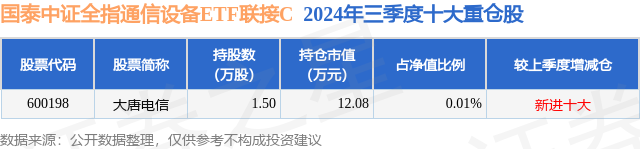 从基金规模来看,国泰中证全指通信设备ETF联接C基金2024年三季度公布的基金规模为6.01亿元,较上一期规模5.05亿元变化了9595.95万元,环比变化了19.01%。该基金最新一期资产配置为:股票占净值比0.01%,无债券类资产,现金占净值比6.89%。从基金持仓来看,该基金当季前十大股票仓位达0.01%,第一大重仓股为大唐电信(600198),持仓占比为0.01%。