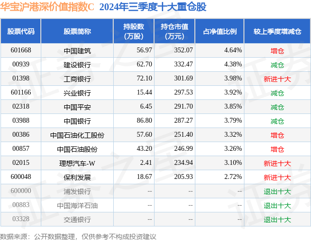 从基金规模来看,华宝沪港深价值指数C基金2024年三季度公布的基金规模为0.05亿元,较上一期规模396.33万元变化了55.85万元,环比变化了14.09%。该基金最新一期资产配置为:股票占净值比94.74%,无债券类资产,现金占净值比6.1%。从基金持仓来看,该基金当季前十大股票仓位达36.96%,第一大重仓股为中国建筑(601668),持仓占比为4.64%。