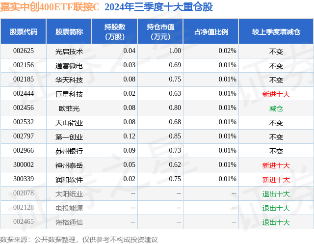 证券之星消息,日前嘉实中创400ETF联接C基金公布三季报,2024年三季度最新规模0.05亿元,季度净值涨幅为17.39%。