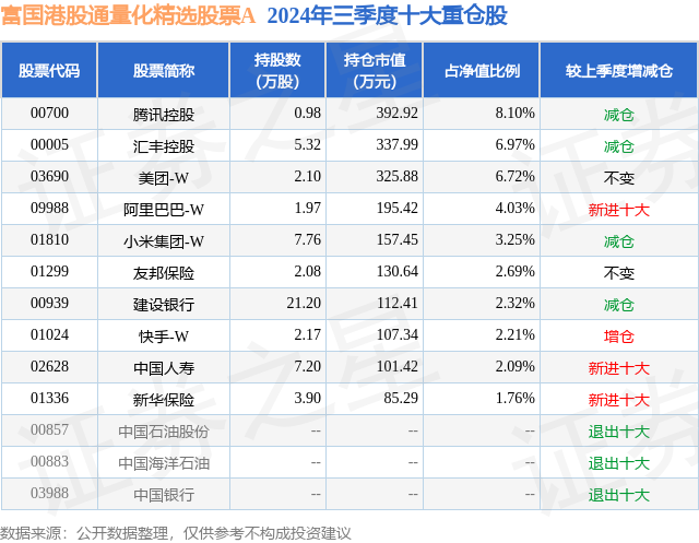 从基金规模来看,富国港股通量化精选股票A基金2024年三季度公布的基金规模为0.3亿元,较上一期规模2483.24万元变化了540.11万元,环比变化了21.75%。该基金最新一期资产配置为:股票占净值比90.02%,无债券类资产,现金占净值比9.42%。从基金持仓来看,该基金当季前十大股票仓位达40.14%,第一大重仓股为腾讯控股(00700),持仓占比为8.1%。