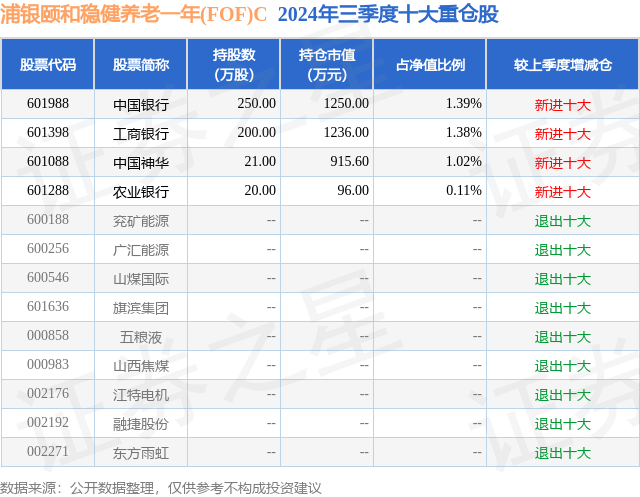 从基金规模来看,浦银颐和稳健养老一年(FOF)C基金2024年三季度公布的基金规模为6.1亿元,较上一期规模6.77亿元变化了-6692.0万元,环比变化了-9.88%。该基金最新一期资产配置为:股票占净值比3.89%,债券占净值比5.38%,现金占净值比0.67%。从基金持仓来看,该基金当季前十大股票仓位达3.9%,第一大重仓股为中国银行(601988),持仓占比为1.39%。