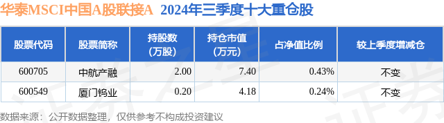 从基金规模来看,华泰MSCI中国A股联接A基金2024年三季度公布的基金规模为0.11亿元,较上一期规模938.51万元变化了132.11万元,环比变化了14.08%。该基金最新一期资产配置为:股票占净值比0.67%,债券占净值比1.17%,现金占净值比3.89%。从基金持仓来看,该基金当季前十大股票仓位达0.67%,第一大重仓股为中航产融(600705),持仓占比为0.43%。
