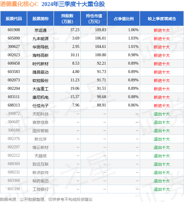从基金规模来看,诺德量化核心C基金2024年三季度公布的基金规模为0.29亿元,较上一期规模2546.77万元变化了364.62万元,环比变化了14.32%。该基金最新一期资产配置为:股票占净值比89.29%,无债券类资产,现金占净值比5.13%。从基金持仓来看,该基金当季前十大股票仓位达9.38%,第一大重仓股为京运通(601908),持仓占比为1.06%。