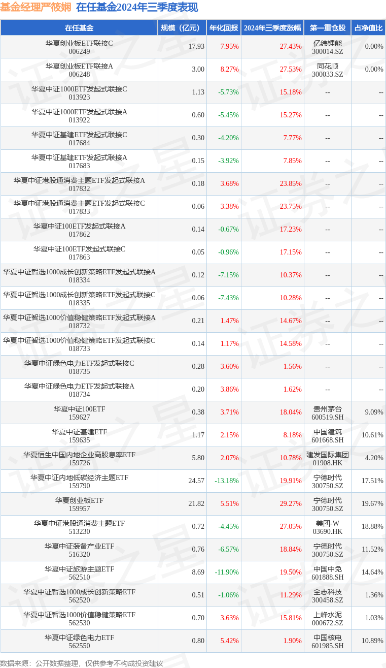 华夏创业板ETF联接C现任基金经理为严筱娴。其中在任基金经理严筱娴已从业3年又154天,2021年7月19日正式接手管理华夏创业板ETF联接C,任职期间累计回报为-31.69%。目前还管理着27只基金产品(包括A类和C类),其中本季度表现最佳的基金为华夏创业板ETF(159957),季度净值涨幅为29.27%。