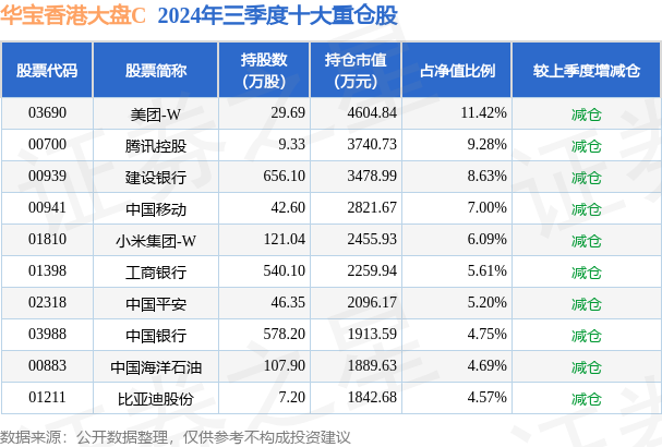 从基金规模来看,华宝香港大盘C基金2024年三季度公布的基金规模为1.29亿元,较上一期规模1.12亿元变化了1679.61万元,环比变化了15.02%。该基金最新一期资产配置为:股票占净值比91.89%,无债券类资产,现金占净值比6.44%。从基金持仓来看,该基金当季前十大股票仓位达67.24%,第一大重仓股为美团-W(03690),持仓占比为11.42%。