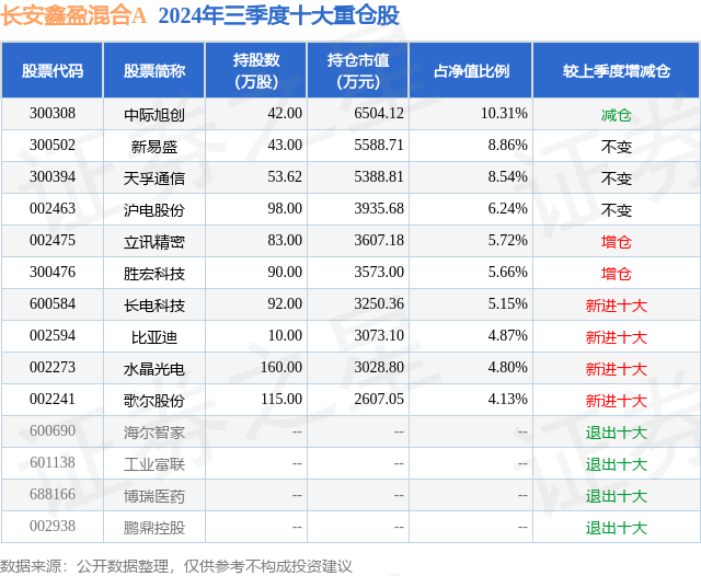 从基金规模来看,长安鑫盈混合A基金2024年三季度公布的基金规模为5.29亿元,较上一期规模5.24亿元变化了491.12万元,环比变化了0.94%。该基金最新一期资产配置为:股票占净值比92.98%,无债券类资产,现金占净值比7.52%。从基金持仓来看,该基金当季前十大股票仓位达64.28%,第一大重仓股为中际旭创(300308),持仓占比为10.31%。