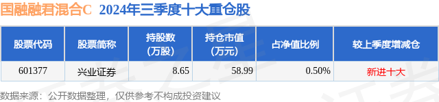 从基金规模来看,国融融君混合C基金2024年三季度公布的基金规模为1.14亿元,较上一期规模1.43亿元变化了-2835.22万元,环比变化了-19.89%。该基金最新一期资产配置为:股票占净值比0.5%,债券占净值比101.39%,现金占净值比13.93%。从基金持仓来看,该基金当季前十大股票仓位达0.5%,第一大重仓股为兴业证券(601377),持仓占比为0.5%。