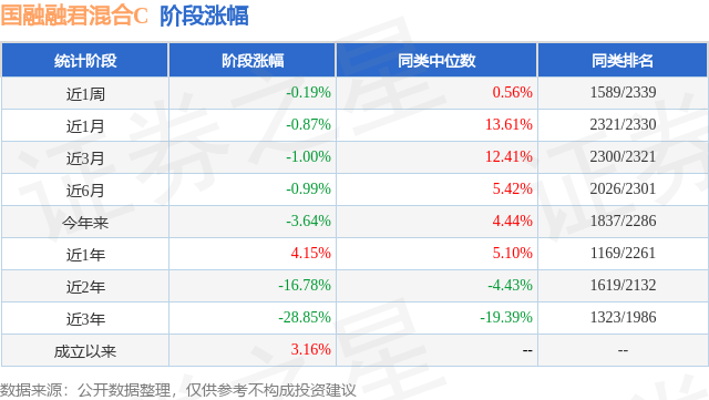 从业绩表现来看,国融融君混合C基金过去一年净值涨幅为4.15%,在同类基金中排名1169/2261,同类基金过去一年净值涨幅中位数为5.1%。而基金过去一年的最大回撤为-5.04%,成立以来的最大回撤为-49.73%。