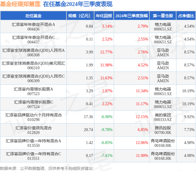 汇添富全球消费混合(QDII)人民币C现任基金经理为郑慧莲。其中在任基金经理郑慧莲已从业6年又321天,2018年9月21日正式接手管理汇添富全球消费混合(QDII)人民币C,任职期间累计回报为95.54%。目前还管理着11只基金产品(包括A类和C类),其中本季度表现最佳的基金为汇添富品牌驱动六个月持有混合(010298),季度净值涨幅为12.15%。
